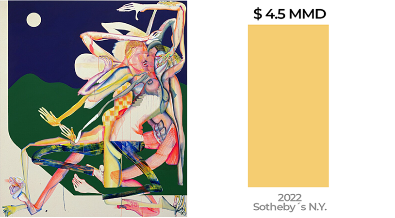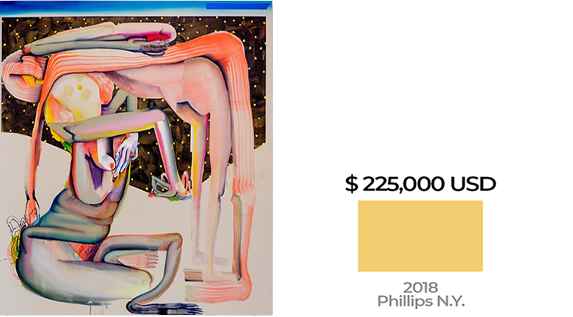 Su obra ha tenido un asombroso crecimiento en valor comercial. En 2017, cuando tenía solo 30 años, vendió un primer lienzo por 36,000 dólares. Al año siguiente, en 2018, la obra “Fellow Travelers, Flaming Creatures”, obtuvo en subasta la inesperada cantidad de 735,000 dólares. Con 35 años de edad, los precios de la artista han aumentado de nuevo, hasta los 5.2 millones de dólares con su pintura “Happening”, vendida en 2022.