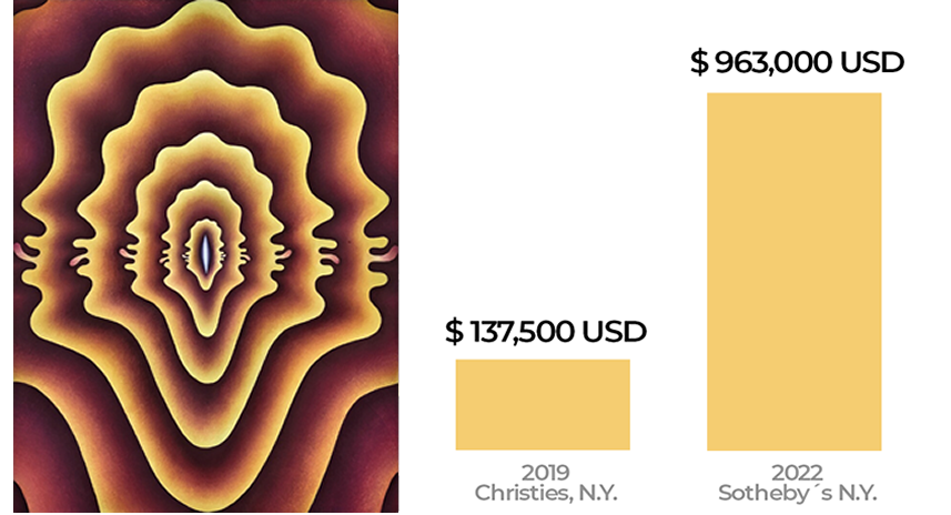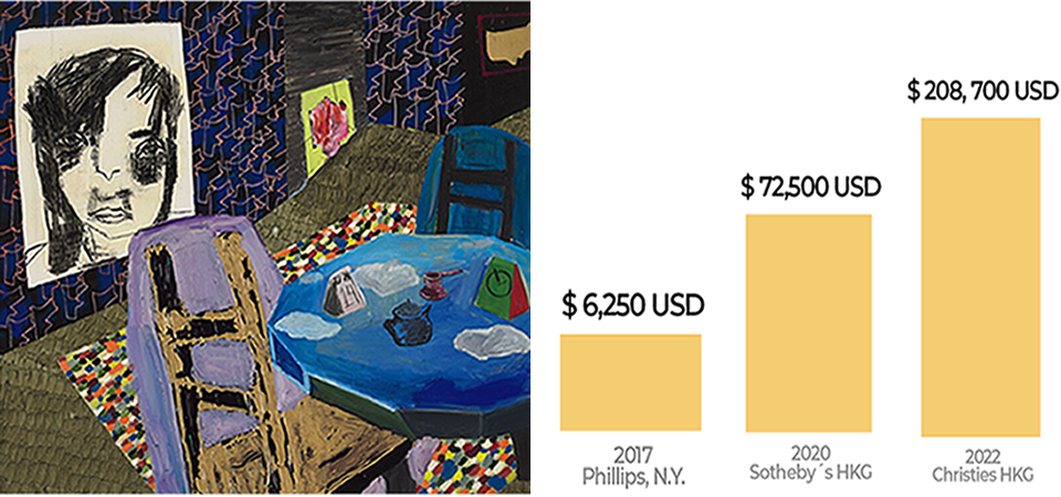 Su lienzo “Lick Lick in Orange and Blue” fue adquirido en Nueva York por 137,500 dólares en 2019 y posteriormente revendido en Hong Kong por 963,000 dólares; es decir, la obra aumentó 7 veces más su valor en su segunda venta en abril de 2022.