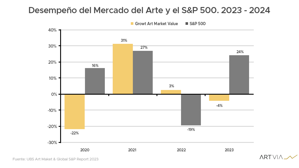 Después de los sólidos crecimientos que experimentó el mercado del arte en 2021 y 2022, con incrementos del 31% y 3%, respectivamente, este registró su primera disminución desde el ya lejano 2020. Es importante destacar que, aunque el S&P 500 experimentó un aumento del 24% en 2023, al considerar el promedio de los últimos tres años, el mercado del arte aún mantiene una ventaja en términos de crecimiento, de un total del 30% superando el desempeño del +27% que ha registrado el S&P 500 en el mismo periodo.