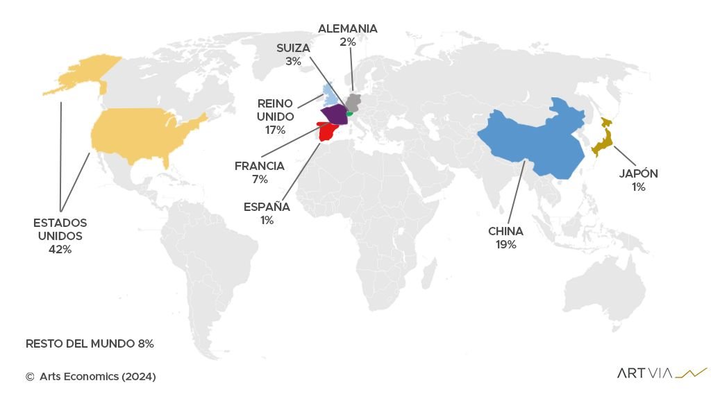 China, se convirtió en el segundo mercado de arte mundial más grande, con un aumento al 19 %, sin embargo un mercado inmobiliario chino en crisis y otros signos de malestar económico probablemente se verán afectados en 2024, mientras que el Reino Unido, el segundo mercado mas importante, cayó el año pasado un 8 % por debajo de los niveles de 2019, volviendo al tercer lugar con un 17 %, atribuyéndose también a sus problemas persistentes del Brexit, segun informó Art Economics.